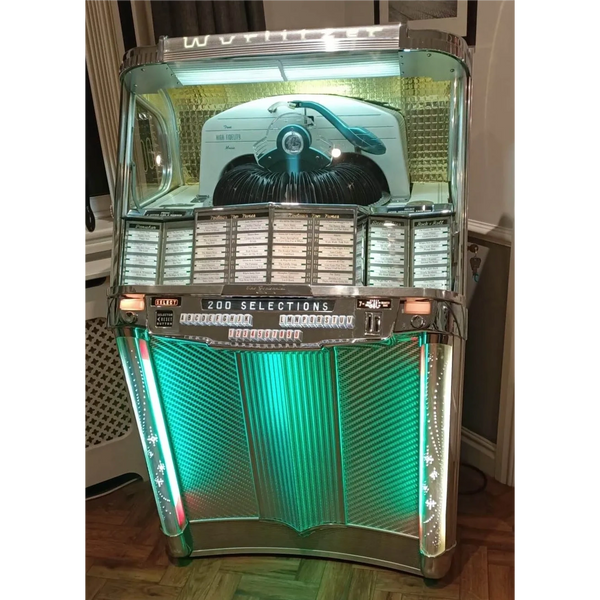 The Wurlitzer 2000 "Centennial" is a highly coveted vintage jukebox from 1956, built to celebrate the Wurlitzer Company's 100th anniversary. It was one of the first to feature a 200-selection mechanism using 100 45rpm records and incorporated a decorative carousel mechanism, backlit glass, and a unique page-turning title display. Known for its attractive design the 2000 Centennial remains a highly sought-after collector's item due to its rarity and quality craftsmanship.